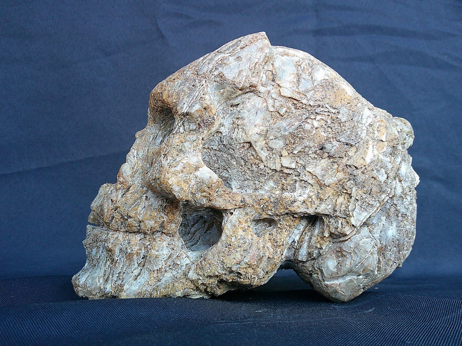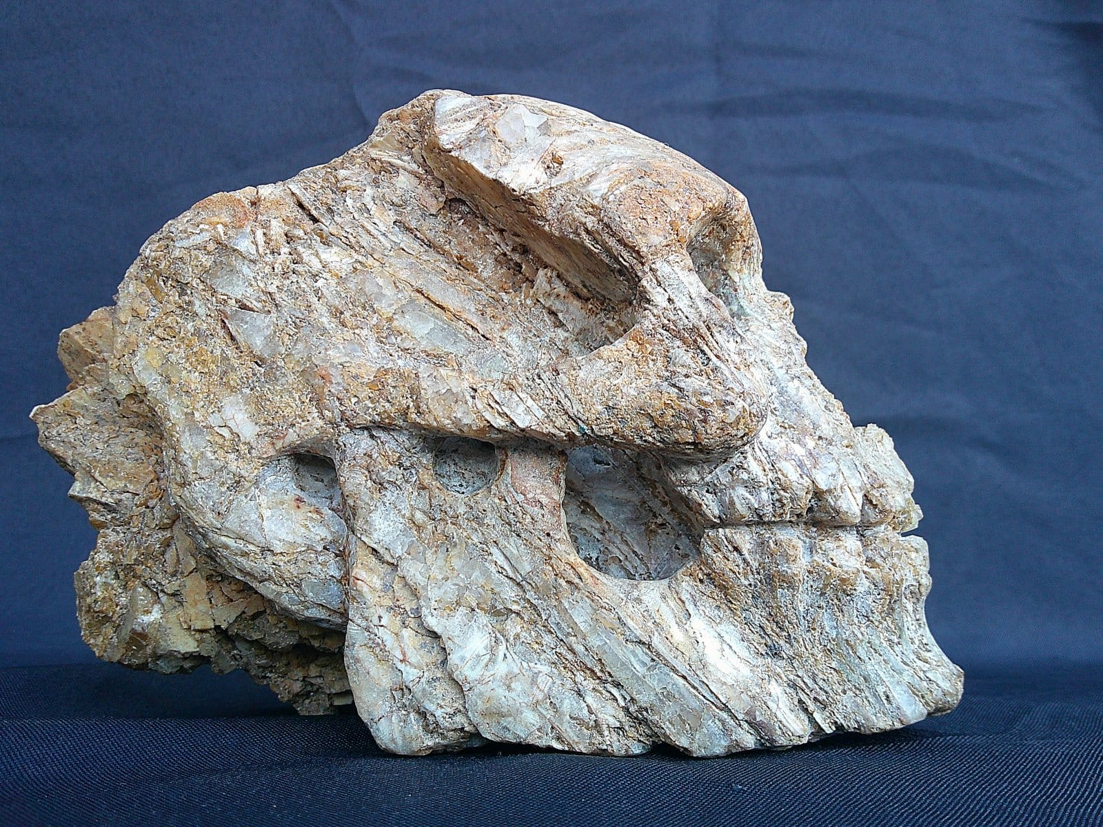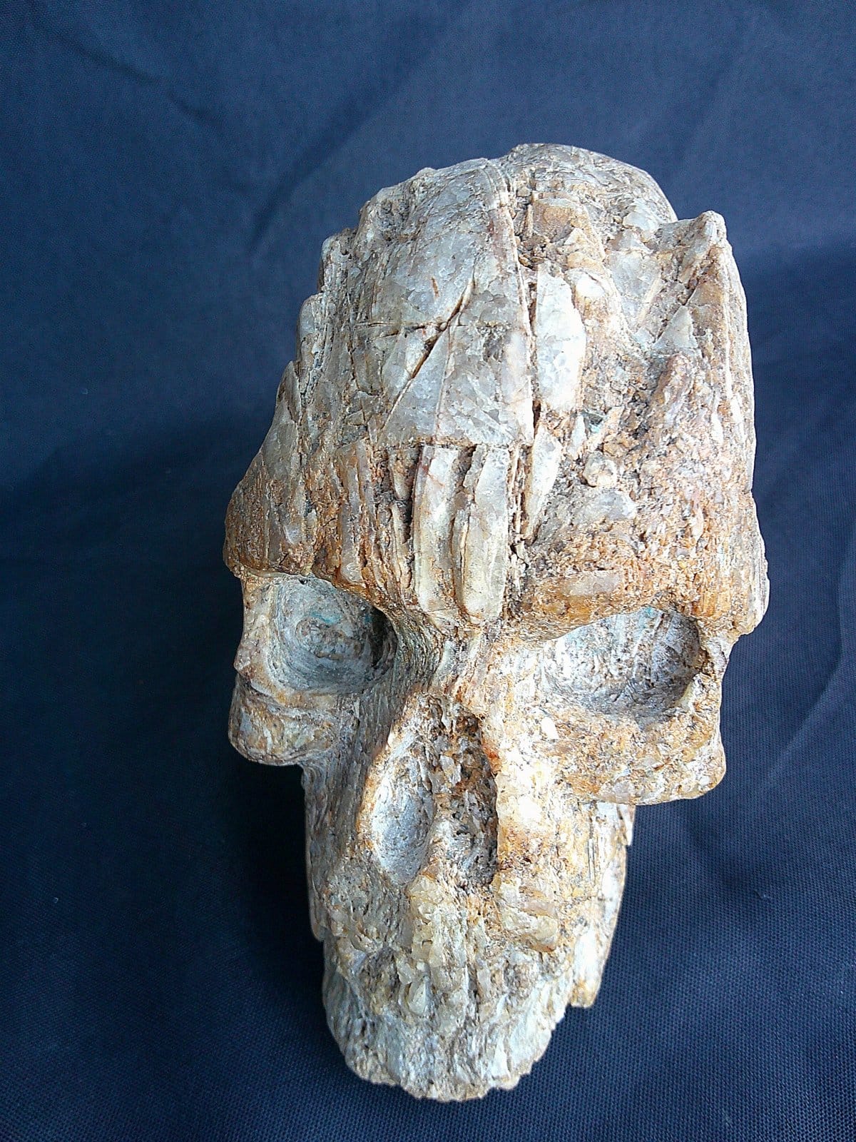 Sculpture de crâne réalisée dans un bloc de quartz dense et lumineux issu du bassin decazevillois. Le minéral présente des tons blancs nuancés de terres de Sienne naturelles, ainsi que des veines cristallines laissées brutes. La surface conserve un aspect rugueux et irrégulier, renforçant l’impression d’un objet ancien extrait de la roche.