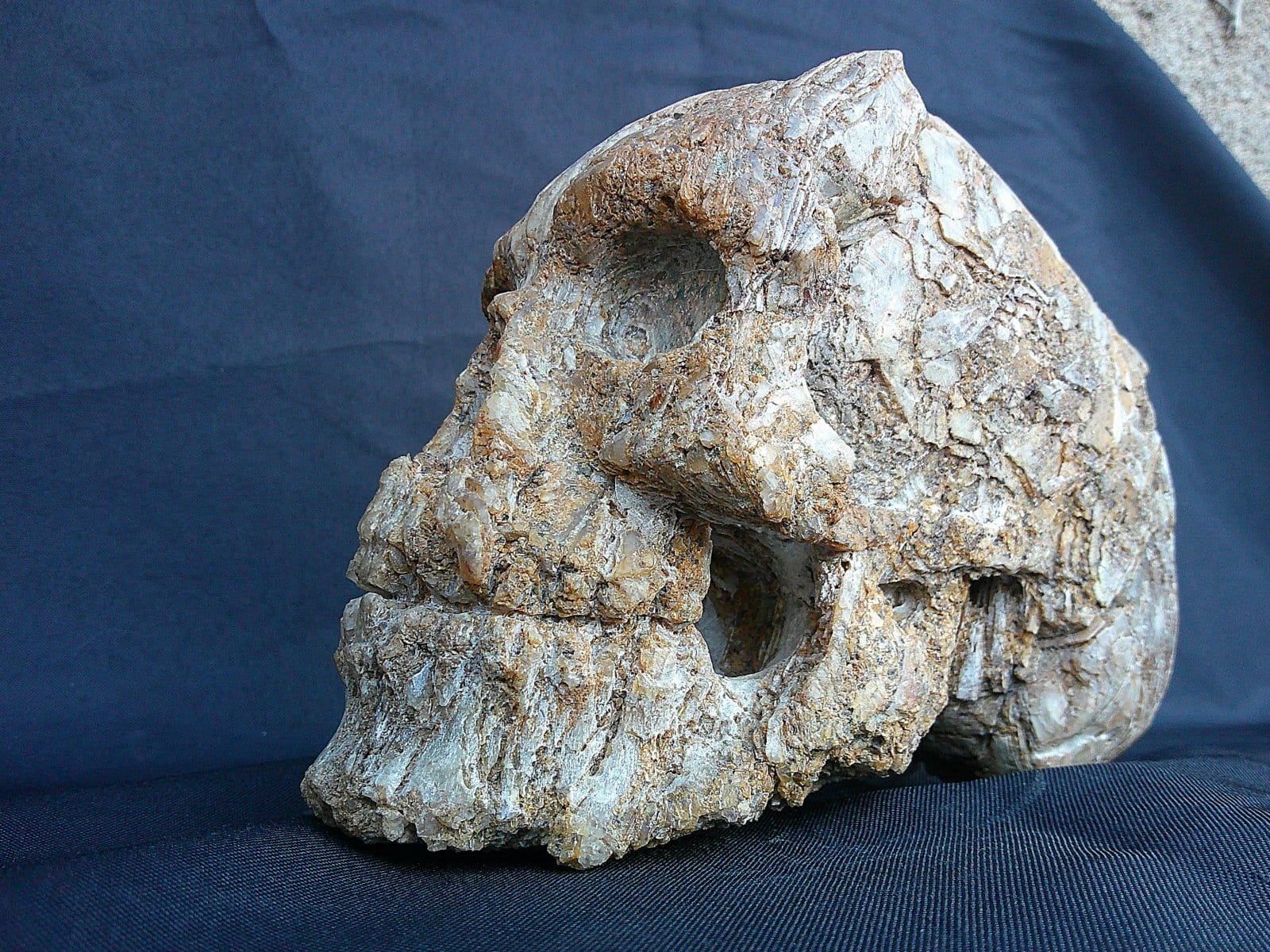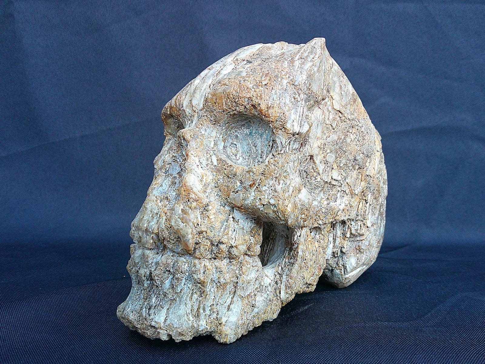Avec Le Quartzien, la sculpture joue sur la frontière entre forme humaine et matière géologique. Le crâne est représenté comme une forme ancienne, conservée dans la roche, offrant une lecture à la fois symbolique et minérale, sans effet ajouté.